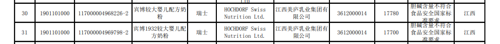值得注意的是,当中涉及来自江西美庐进口的瑞士宾博较大婴儿配方奶粉胆碱含量不符合食品安全国家标准要求。