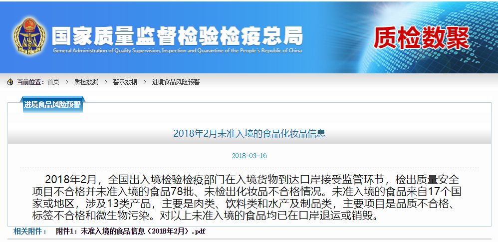 根据国家质检总局公布的2017年6月未予准入的食品化妆品信息,2月,全国出入境检验检疫部门在入境货物到达口岸接受监管环节,检出质量安全项目不合格并未准入境的食品78批。