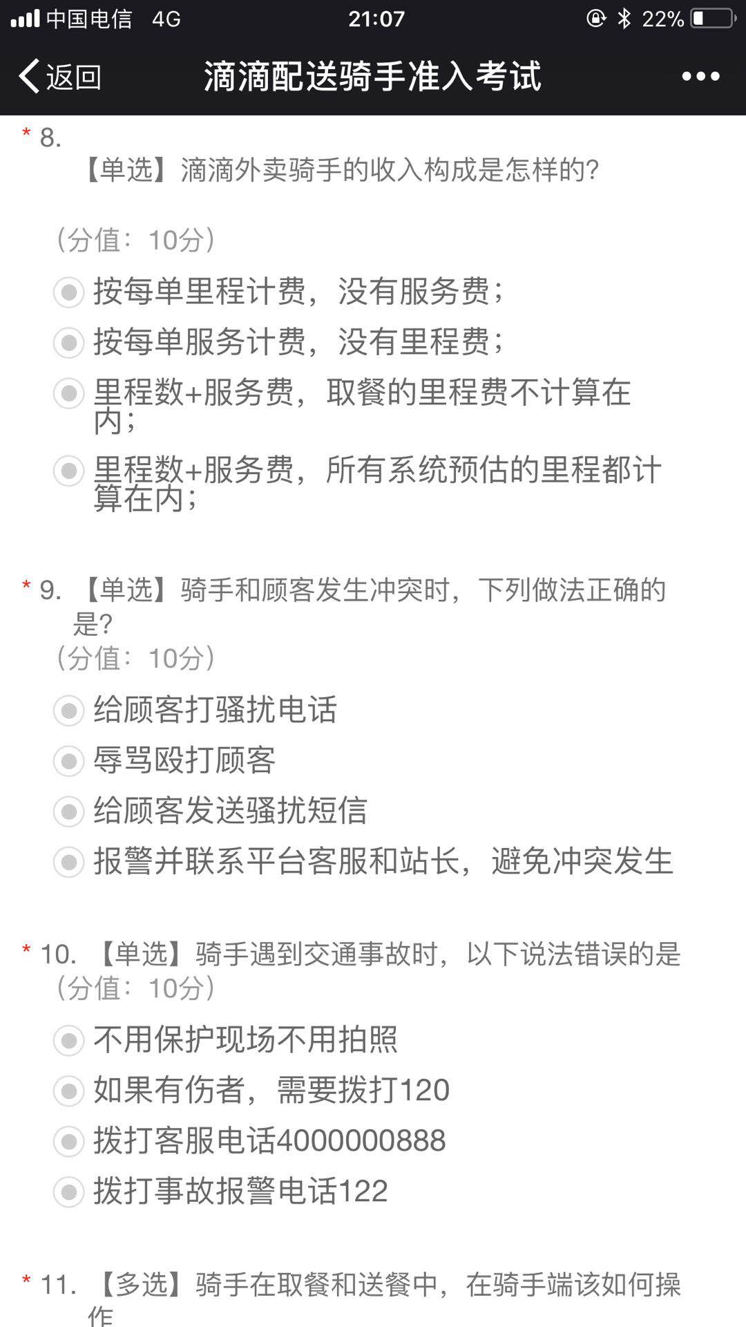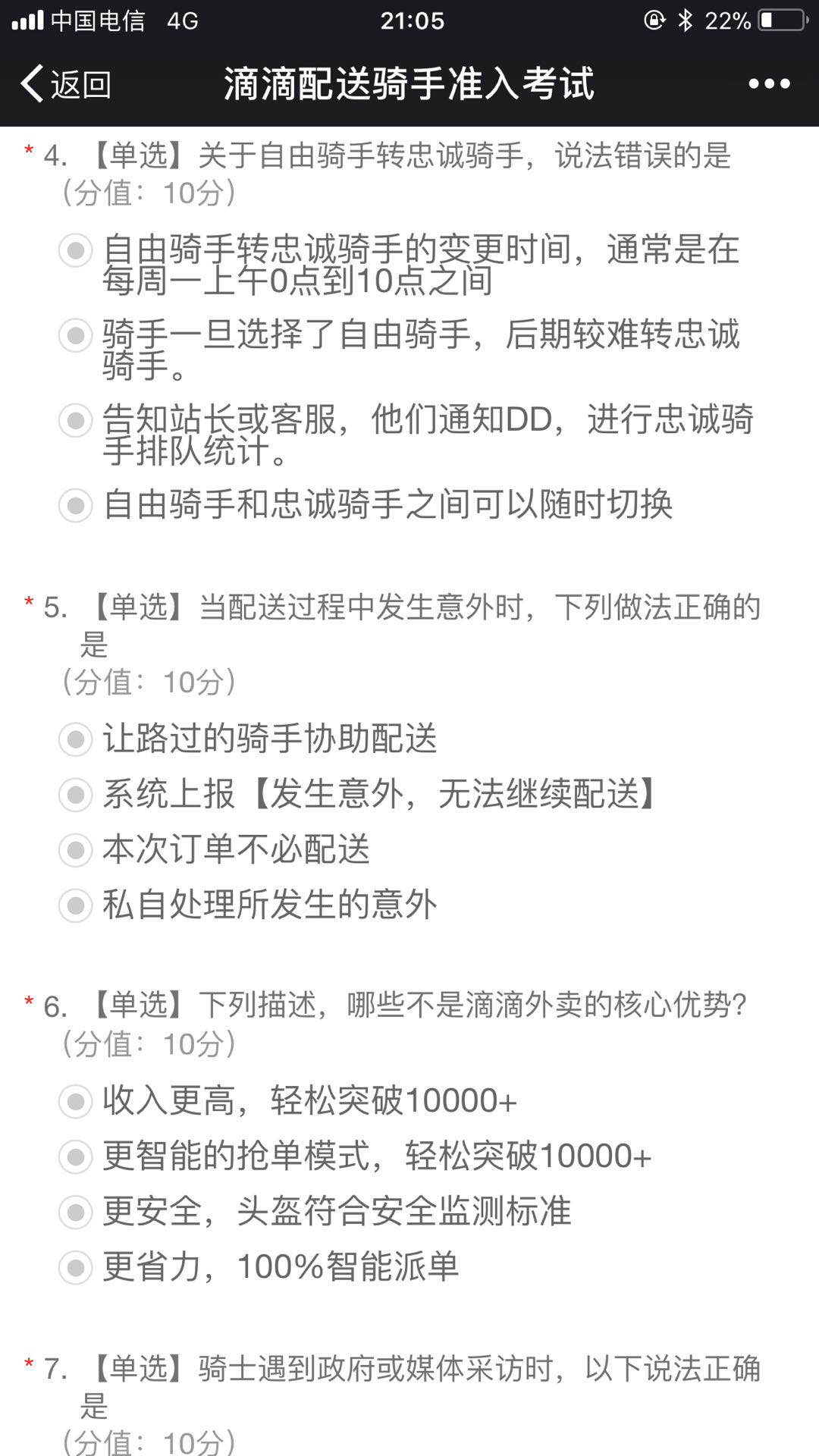 滴滴配送骑手准入考试题目主要与交通安全、基础业务知识、收入分成、客户服务等相关。