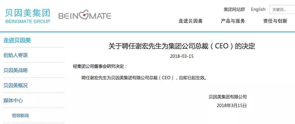 今天,小食代在贝因美集团官网上看到的一则简短消息称,3月15日,贝因美集团有限公司发出《关于聘任谢宏先生为集团公司总裁(CEO)的决定》,当中表示: