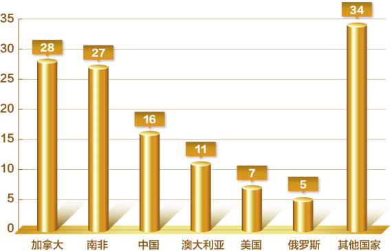 500年前,欧洲探险家来到加拿大,一是探索通向东方的航道,二是寻找传说中的黄金。可惜,这两样都没找到,殖民者遂就地取材,做起了毛皮和渔业生意。现在看来,只能怪他们运气不好,实际上加拿大不仅真的有黄金,而且数量极大。根据相关数据,在全球范围内,非洲黄金储量最高,占全球总量28%;其次是北美,占24%;接下来是澳洲、亚洲、南美和欧洲,分别占19%、18%、9%和2%。具体到加拿大,黄金储量在4200吨左右,居世界第7位。