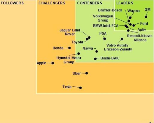 众所周知,提及与传统车企和创业公司间的竞争,业内更多想到的就是自动驾驶。近日,咨询公司Navigant的一份新报告引起汽车界人士的广泛关注,这份报告列出具有代表性的19家无人驾驶汽车企业并对它们进行了排名。其中特斯拉排名垫底。