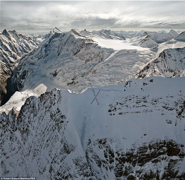 2011年艾格尔峰北坡上,登山者们不顾危险组成了雪地上的X图案。