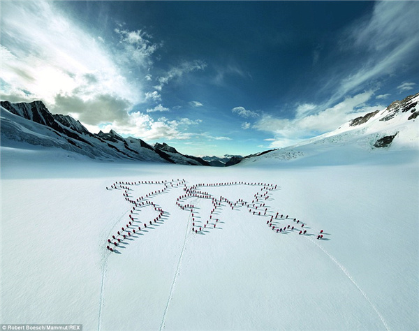 2012年,为了庆祝公司的150岁生日,这个团队在艾格尔峰,Mˆnch峰和圣母峰之间的Ewig Schneefeld上拼出了这幅世界地图。