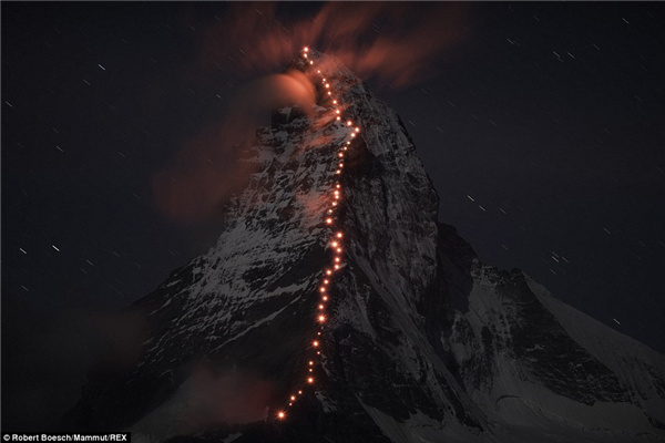 猛犸象公司为他们首次攀登马特洪峰表达敬意,登山向导们打开安全帽上的灯在Hörnligrat的背脊上一字排开。