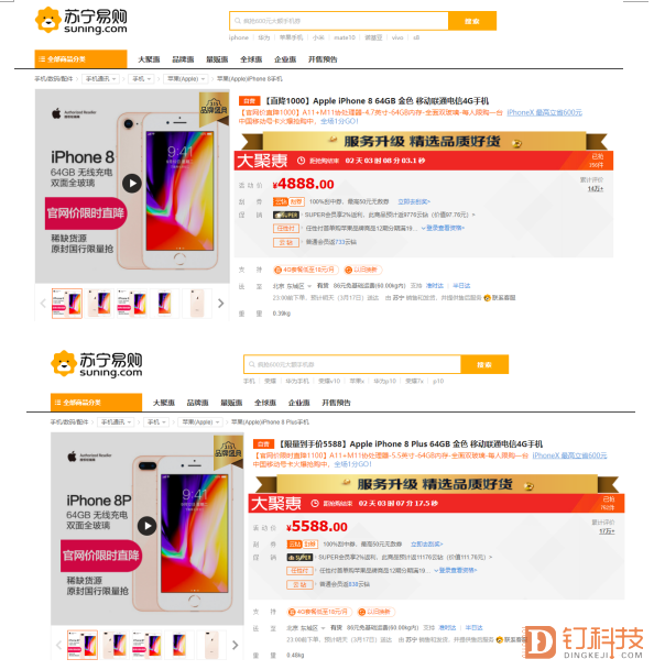 据钉科技了解,在京东、苏宁等电商平台上,iPhone 8系列开启了限时特惠活动。其中,在京东平台的自营旗舰店,iPhone 8的64GB版本现成交价为4999元,相比官网价直降889元;iPhone 8 Plus的64GB版本现成交价为5688元,相比官网价直降1000元。而苏宁的优惠力度更大,在其官方自营旗舰店,iPhone 8的64GB版本直降1000元,现售4888元;iPhone 8 Plus的64GB版本直降1100元,现售5588元。值得一提的是,苏宁平台的该抢购活动注明了时间限制。