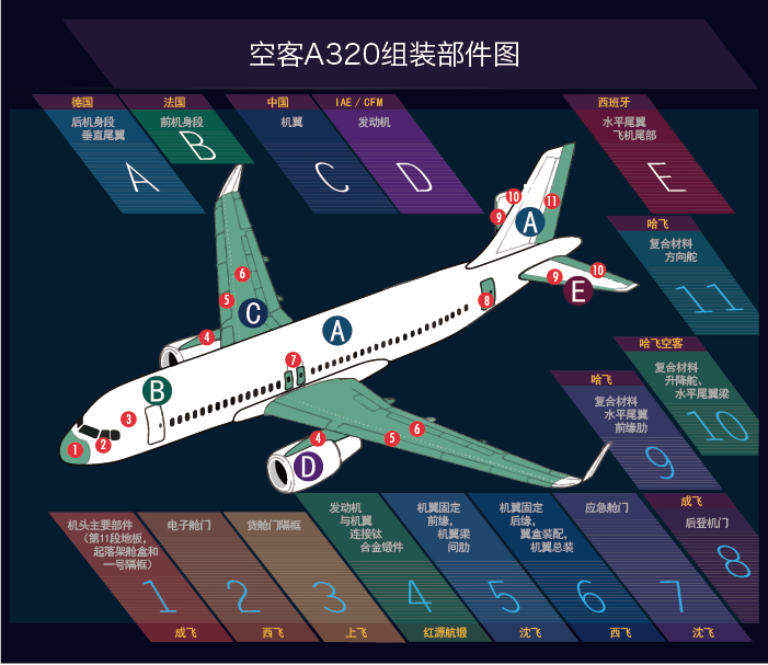 一架空客A320飞机有上百万个零部件,它们来自空客公司遍布20多个国家和地区的2000多家公司组成的全球供应商网络。不管有多少零部件,最后送到总装线装配成整飞机的是几个主要的大部件。