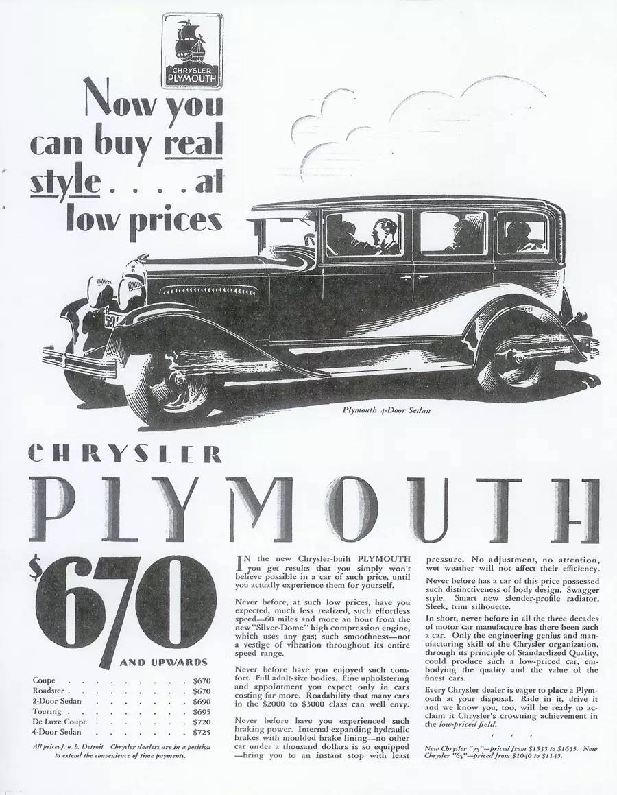 20世纪20年代,美国作为世界上第一个车轮上的国家渐渐形成:汽车走入寻常百姓人家。美国汽车低价市场最初是雪佛兰和福特两家的天下,不过到1928年,克莱斯勒决定在廉价车上分一杯羹,普利茅斯(Plymouth)因此而诞生。