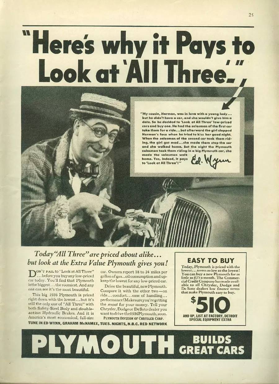 克莱斯勒惊喜之余,更大力来推广这个廉价车品牌,像由著名广告人格切尔为普利茅斯所做的“货比三家”(Look at all three)广告,被视为广告史上的经典之作。