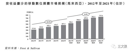 尽管Verto业绩表现出微妙下滑,但移动数位媒体市场仍具有很可观的前景。根据Frost &Sullivan提供的市场规模分析报告,随着移动数位设备及互联网的普及率越来越高,马来西亚移动数位媒体市场的收益由2012年的约3.13亿美元增至2016年的约4.67亿美元,复合年增长率为10.5%,引起了我们对这一市场的关注。