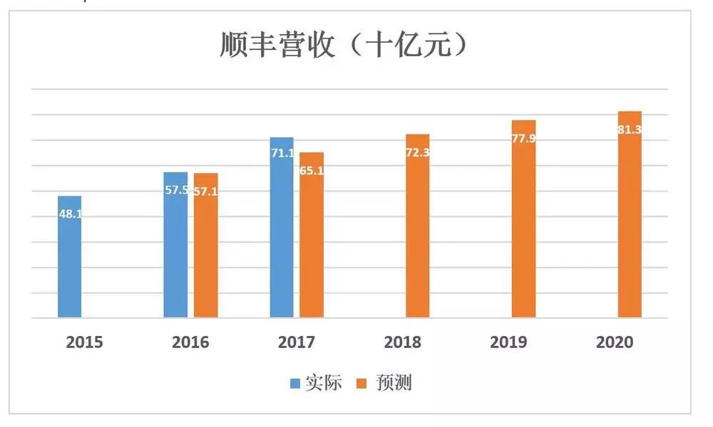 借壳鼎泰新材时,顺丰对2016年~2020年营收进行了预测。在已经过去的2016年、2017年,顺丰营收分别为575亿和711亿,分别比预测高1%和9%。
