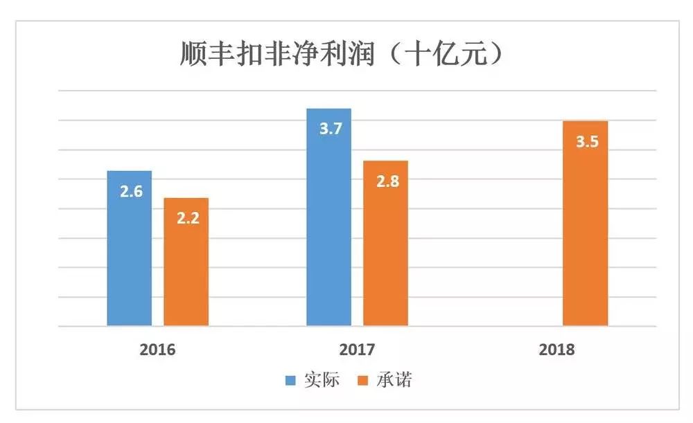 借壳时顺丰承诺:2016年、2017年、2018年“扣非经净利润”分别不低于2.185亿、28.15亿和34.88亿。2016年、2017年,顺丰扣非净利润分别为26.4亿和37亿,分别比承诺数高21%和31.5%。
