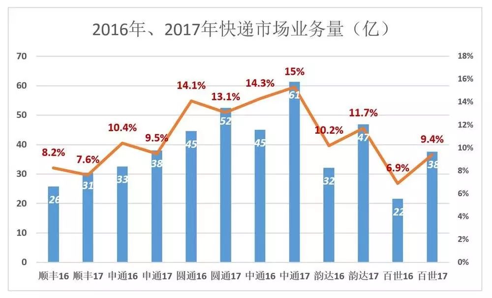 2017年,排名在前的六大快递公司中,顺丰(7.6%)、申通(9.5%)、圆通(13.1%)三家的份额合共下降2.6个百分点。中通、韵达、百世三家合共上升5个百分点,他们增加的份额一半来自顺丰、申通、圆通,另一半来自二三线快递企业。
