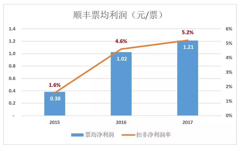 2015年,顺丰每票净利润仅为0.38元,利润率1.6%。2017年每票赚1.21元,利润率达5.2%。