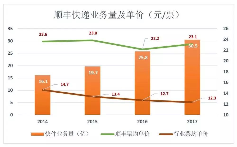 2017年,顺丰完成30.5亿票,平均每票23.1元,较行业均价高87.8%。顺丰市场份额下滑说明绝大多数用户更在意的是价格。