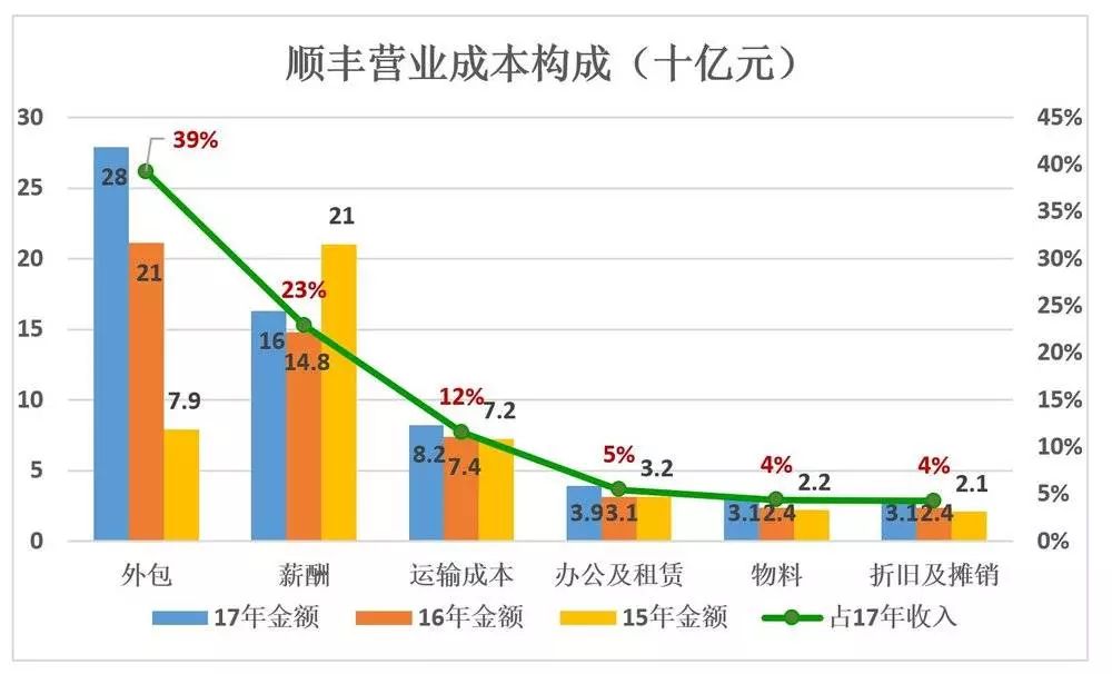 2017年,顺丰外包成本达283.3亿,占营收的39%;职工薪酬达163.1亿,占营收的23%。顺丰21.3万收派人员中,自有员工5.28万人,“其它用工”16万人。“外包成本”主要就是这16万人的薪酬。所以,顺丰总的人力成本超过446亿,占营收的62.8%。