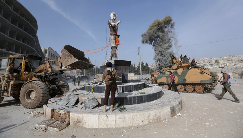 在近两个月的战斗后,土耳其支持的叙利亚反对派宣布占领叙北部城市阿夫林市中心,阿夫林此前为库尔德武装控制区。在进驻市中心后,叙反对派士兵推倒了库尔德传说中的英雄塑像,引发库尔德人抗议。