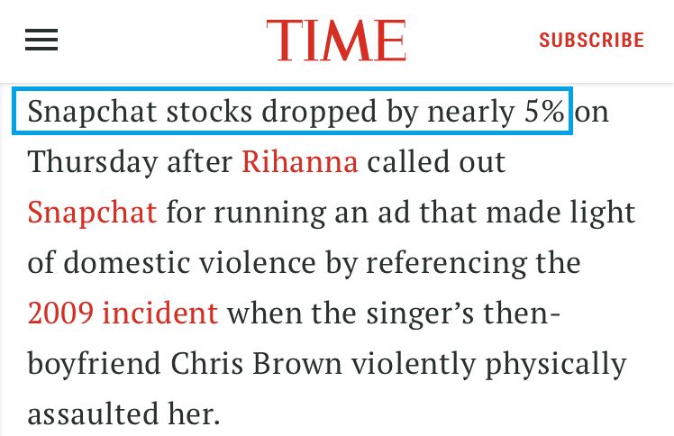在Snapchat宣传营销自家app的广告中(目前已撤下),调侃了蕾哈娜当年遭遇的家暴事件,询问用户在“扇蕾哈娜一巴掌”和“打克里斯·布朗一拳”这两个选项里,“更愿意选择哪一个”。