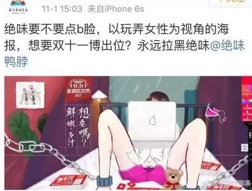2017年11月1日下午,有网友发现,绝味鸭脖旗舰店的营销海报上,出现了一名卡通女性形象,该形象身着一条粉红色短裤,躺在床上,双脚被锁链绑起。