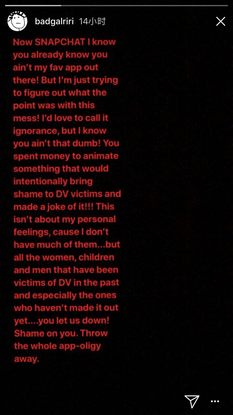 “Snapchat你们现在应该清楚,你们再也不是我喜欢的那个app了。但我还是想弄清楚你们为什么要做出这种破事!我十分想把这一切归咎于你们的疏忽,但我知道你们并没有那么蠢!你们故意花钱去做一个有关家暴受害者的广告,还拿他们开玩笑!这已经不仅仅关乎我的个人感受了,因为我也不太在乎……但在这个世界上还有许多遭受家暴的女性、儿童和男性没有走出阴影。你太让我们失望了!可耻。你们快滚吧!”