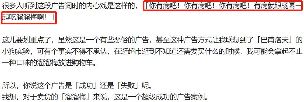 这则广告对杨幂本人的影响有多大呢?有网友是这样评价的:“很多人听到这段广告词时的内心戏是这样的,‘你有病吧!你有病吧!’”