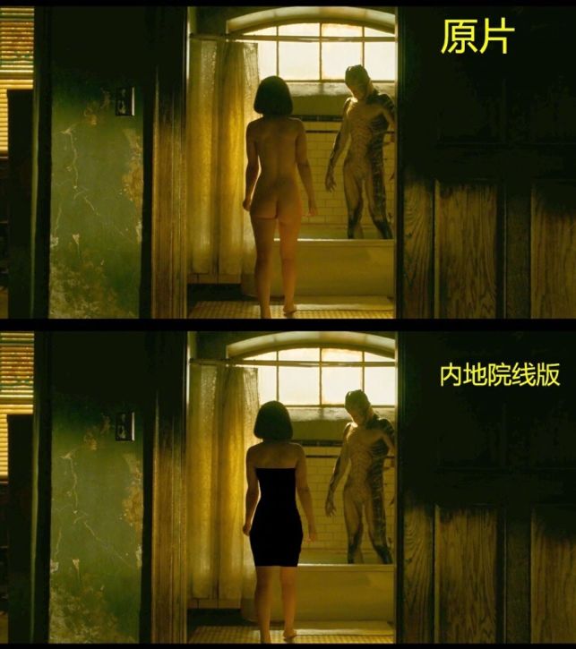 不过前述提到的这些大概只是常规操作,即使是放大画面加以裁剪这种手法,观众在去年的《银翼杀手2049》中就已经领教过了。而到了《水形物语》,可以说作为出品方的福斯又再次做出“创新”,在电影后半部分,艾丽莎首次决定与鱼人结合时,她脱下睡衣全裸向他走去,就是原片中这个画面也只是出现了女性全裸的背影,加上电影本身有些阴暗的基调并不能看的十分清楚。由于这一段的存在与否完全会影响剧情理解,因此没法整个删减,所以公映版本别出心裁通过后期给女主角穿上一条黑色的包臀裙,不过这一举动无疑也是在挑衅观众智商,试问谁会在这种时刻刚脱下一件睡袍又马上换上一件裙子?