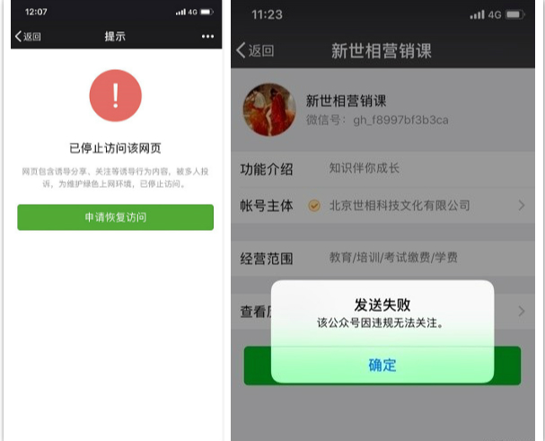 不出所料,新世相该课程的微信二维码,以及“新世相营销课”微信公众号,在上午11点左右,都因为“诱导分享”被停止访问和无法关注。新世相随后回应称,已经关停分销机制,已经获利用户的收益依然可以在APP中提现,提现后最晚3天到账。