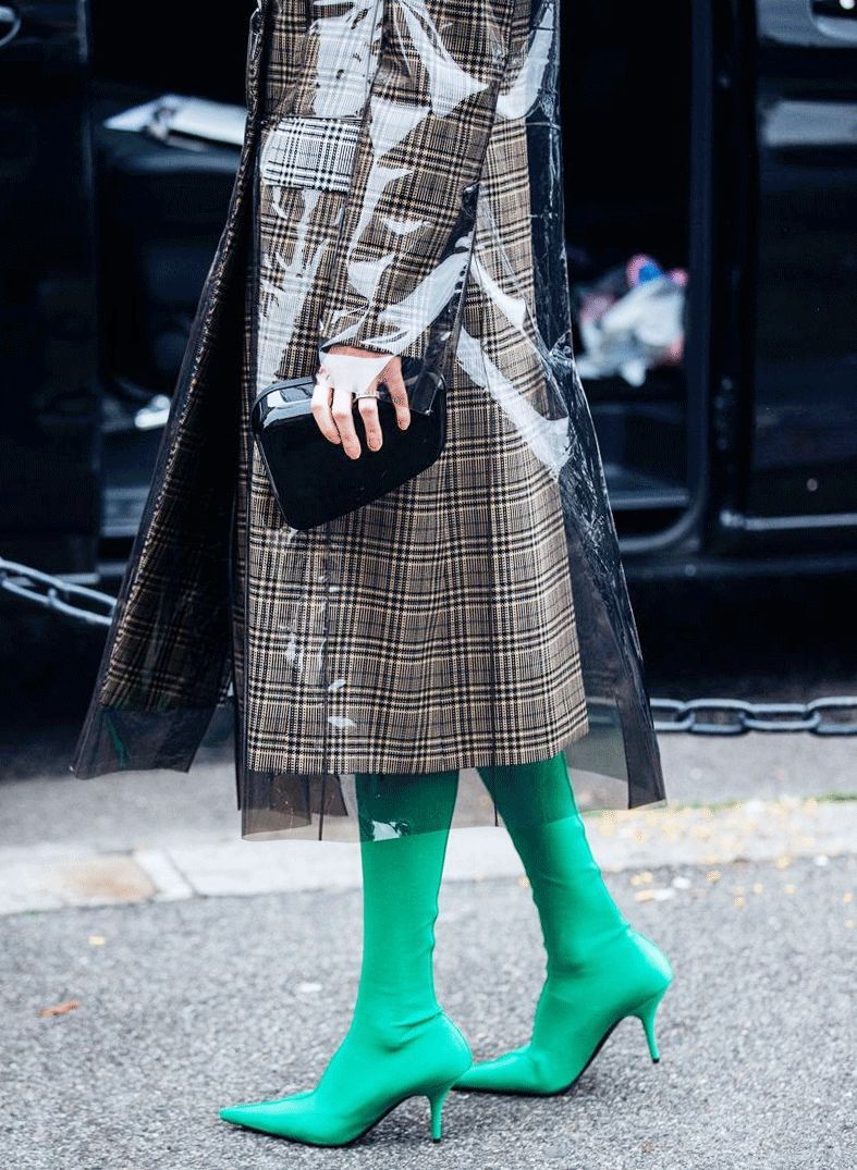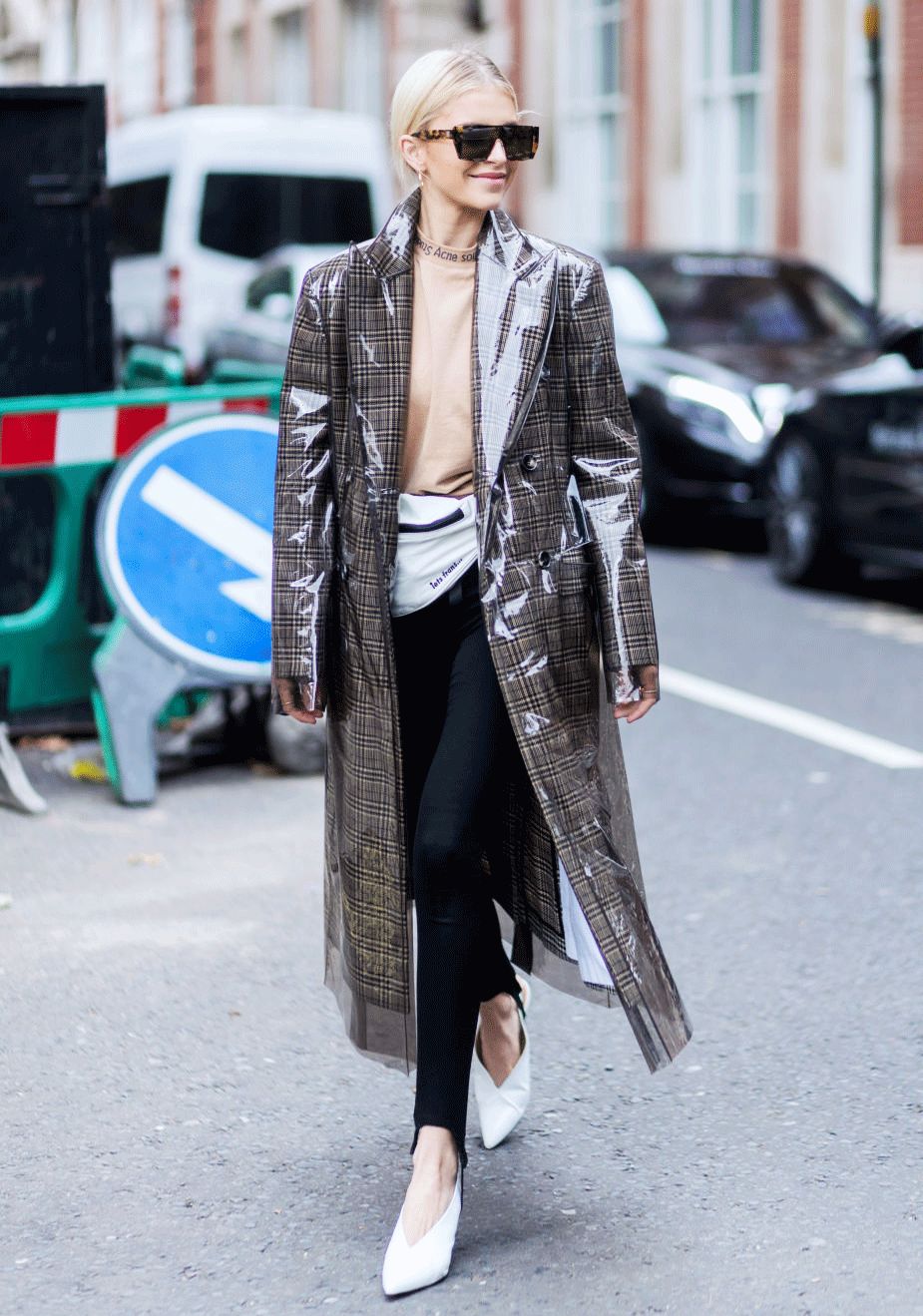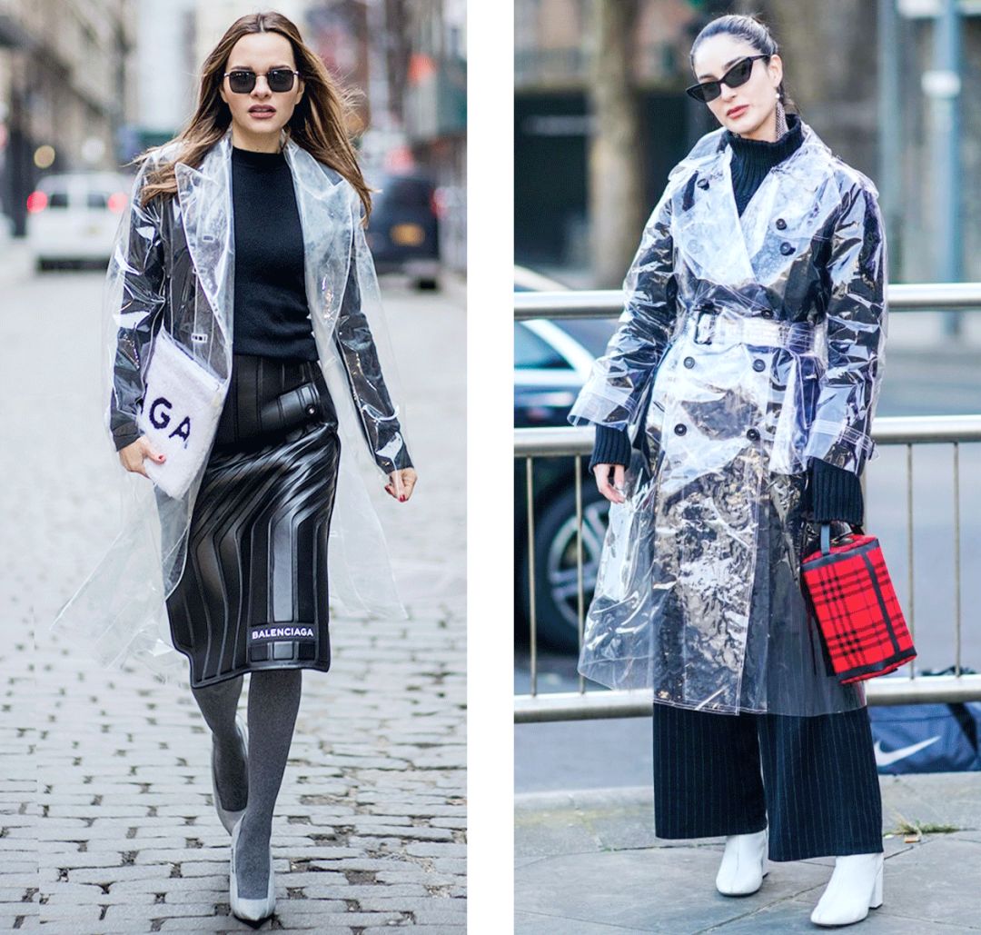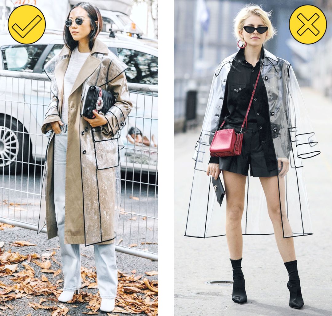 如果你已经花大价钱买了纯透明的PVC雨衣,也不是没办法拯救,里面套件风衣会好一些,只有这样搭配整体感会强一些,有层次,但不突兀。