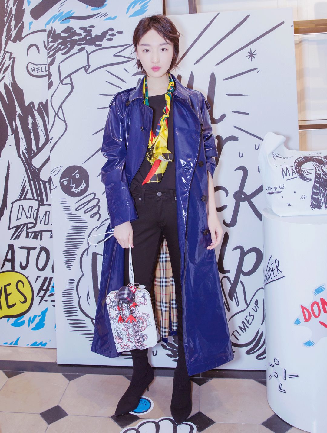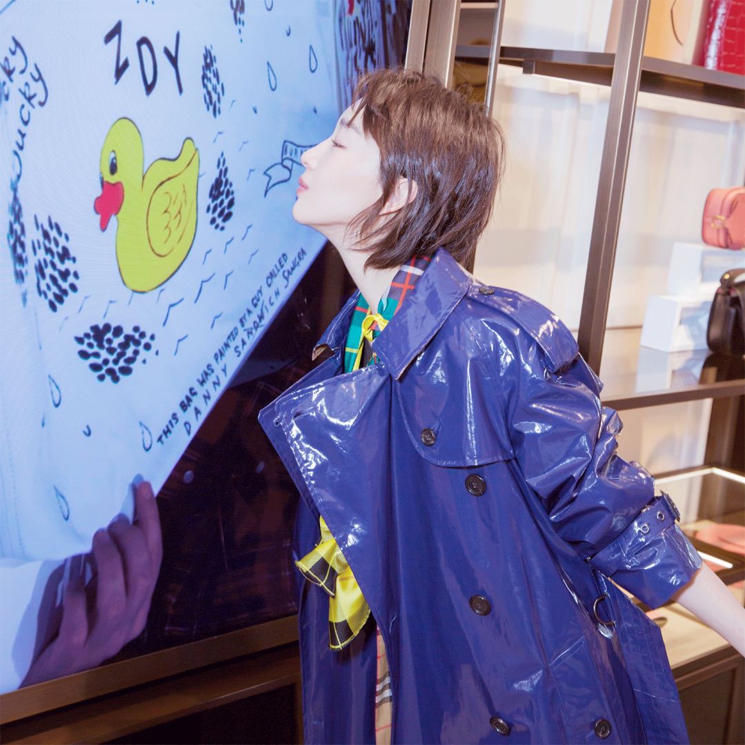 比如像周冬雨穿的这种PVC涂层漆皮大衣,抢眼又特别,并且很实穿,简单搭配小黑裤、短靴就很帅了。