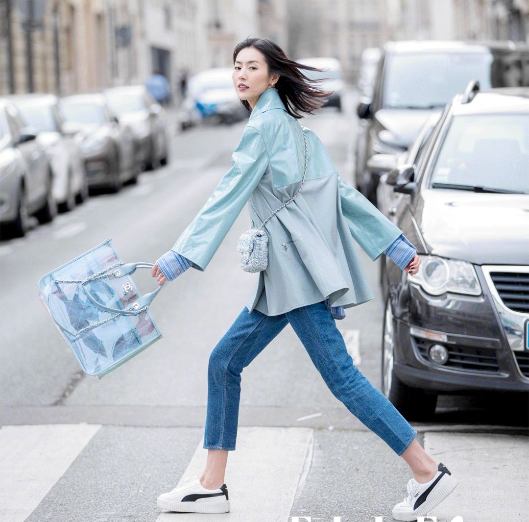 如果像刘雯这样搭配薄荷绿大衣、牛仔裤,就像清泉一样,让人感觉赏心悦目,倍感舒爽。