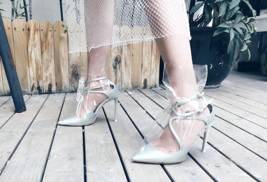 因为外面的PVC薄膜能让鞋子看起来晶莹剔透,大家都叫它 “水晶鞋”。不过,它可不像灰姑娘的水晶鞋那么矫情,甚至比一些普通的高跟鞋还要耐穿。