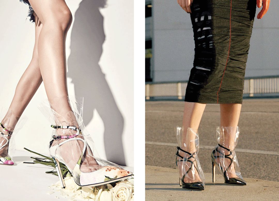 它还能像魔法一样一下就让普通的鞋变得时髦起来。像下面这种纯黑高跟鞋大家都很熟悉吧?几乎每个爱美的女生都会有一双,穿起来很美,但实在没什么特点。包上一层PVC以后立马就成了时髦前卫的代言人,和普通俗气扯不上半点儿关系。