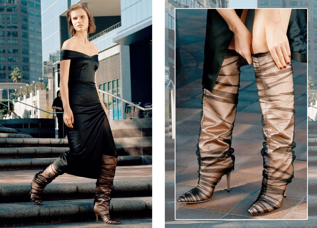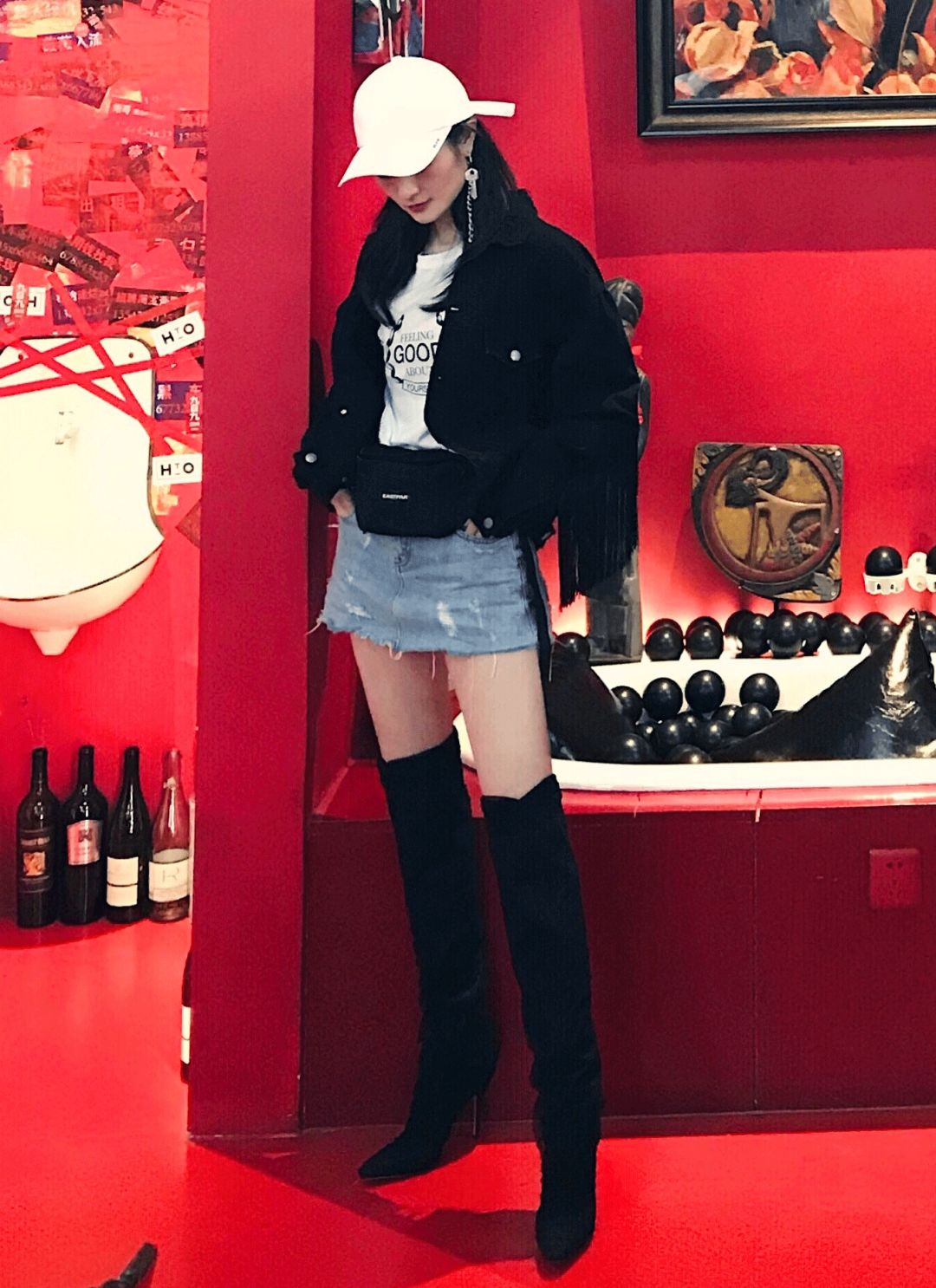 我下面穿的这双是就是黑纱款长靴。穿在脚上和普通的黑长筒靴一样显腿长,显腿细,好搭配。