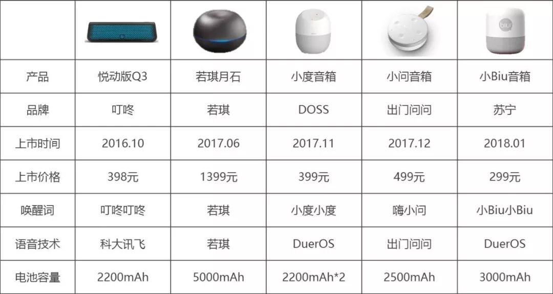 2016年10月,叮咚发布灵动版A3和悦动版Q3,其中Q3内置2200mAH电池,可连续播放8小时,同时搭配Flash charging快充技术。2017年,带电池的便携音箱逐渐增多,包括若琪的月石、DOSS的小度音箱、出门问问的小问音箱等。进入2018年,苏宁发布小Biu智能音箱,搭载DuerOS2.0,配备3000mAh大容量锂电池,在没有电源的情况下可连续工作6小时。