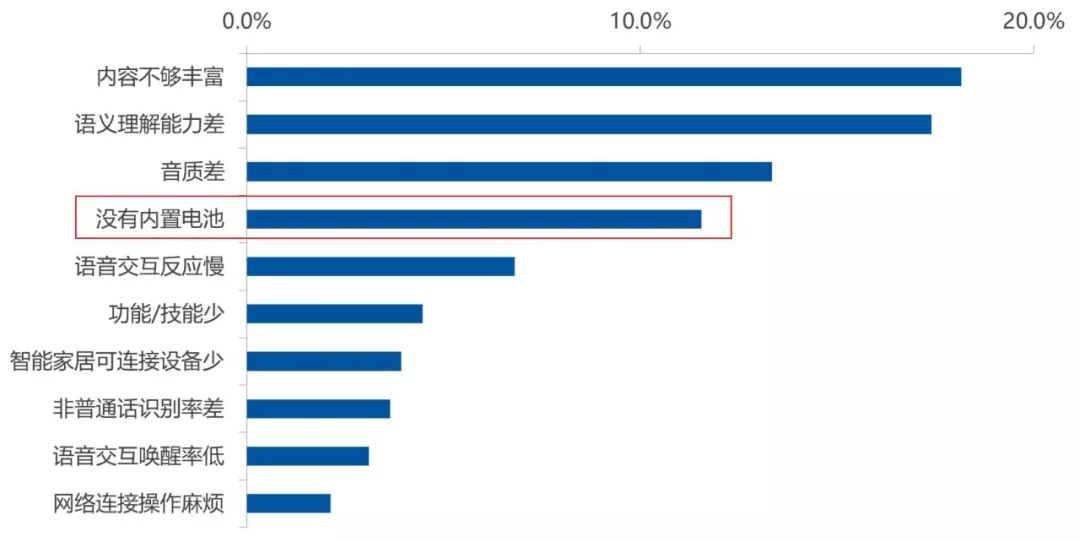 根据奥维云网(AVC)挖掘的主流电商平台重点智能音箱品牌的消费者评价数据显示,不带电池的差评占比达到11.6%,排在第四位。没有内置电池,意味着只能插电使用,不能自由移动及随身携带,使用场景大大受到限制。从机型看,小巧的机型在没有电池方面的差评要高于其他机型。