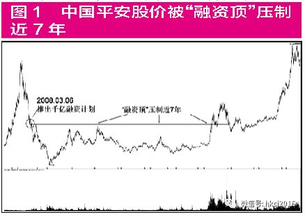 10年前,中国平安的再融资计划公布之后,股价次日便大跌超过6%,此后仍不断下挫,最终在当年的全球性熊市中被投资者“用脚投票”,最终胎死腹中。不仅如此,2008年3月7日中国平安股价复牌之后的开盘价,竟成为此后将近7年的最高价,一直到2014年12月底才又再一次站上(见图1)。7年的“融资顶”让投资者心有余悸,也导致中国平安A股的股价长时间低于H股。