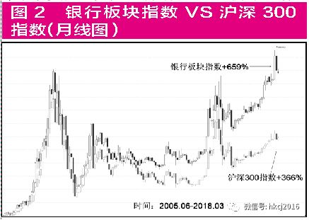 过去10年来,“国家队”多次出手为大型银行股保驾护航,事后都证明是不可重来的铁底。2008年9月18日,中央汇金公司在国际金融危机全面爆发之后宣布出手增持工、农、建、交四大行股票(当时农行未上市),次日股价止跌企稳,除了交行之外,其他三大行的股价在接下来指数创新低的过程中均牢牢守住前低。2009年~2011年,中央汇金公司多次增持四大行股票并参与其配股,这一区间成为长线投资者布局的底部区域。2015年~2016年A股三轮重挫,“国家队”再次出手逢低增持,这期间也成为牛市回调中难得的买点。如果从2005年6月份算起,银行板块指数累计涨幅达659%,而同期沪深300指数的涨幅约366%,银行板块相对大盘的长线超额收益十分明显(见图2)。