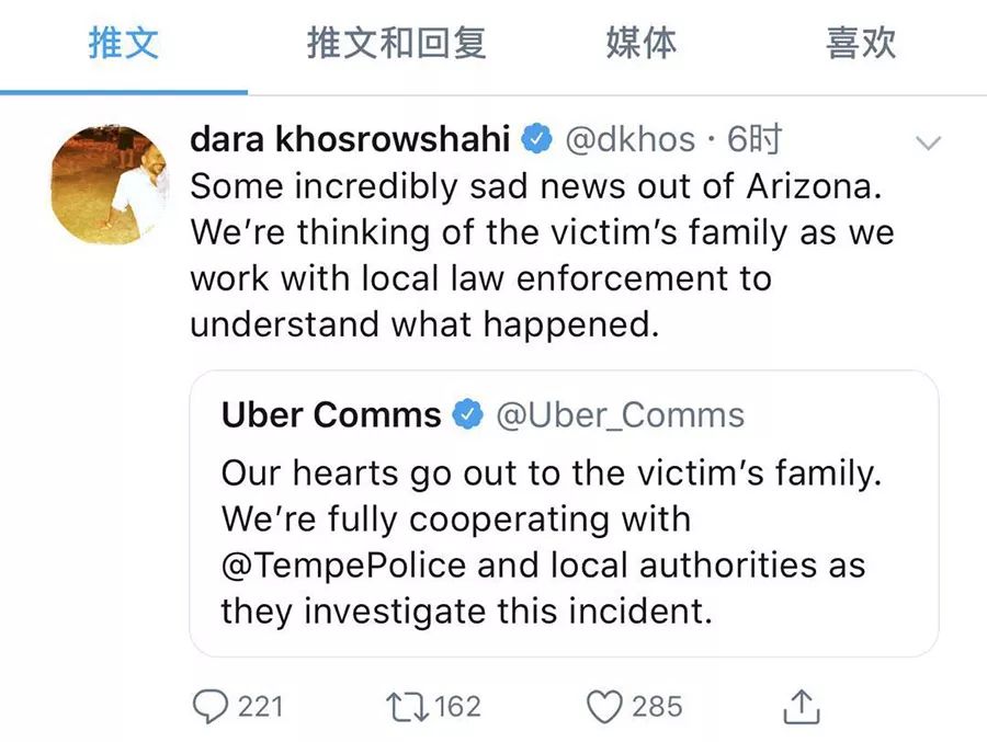 随后,Uber CEO Dara Khosrowshahi也就此事在Twitter上发表了评论表示,“我们与受害者的家人感同身受,并与当地政府部门配合来调查事故原因。”
