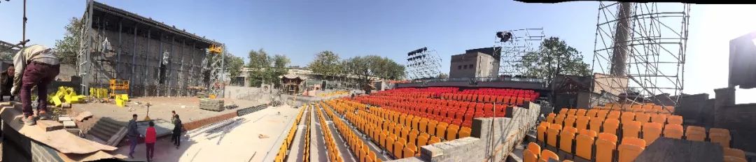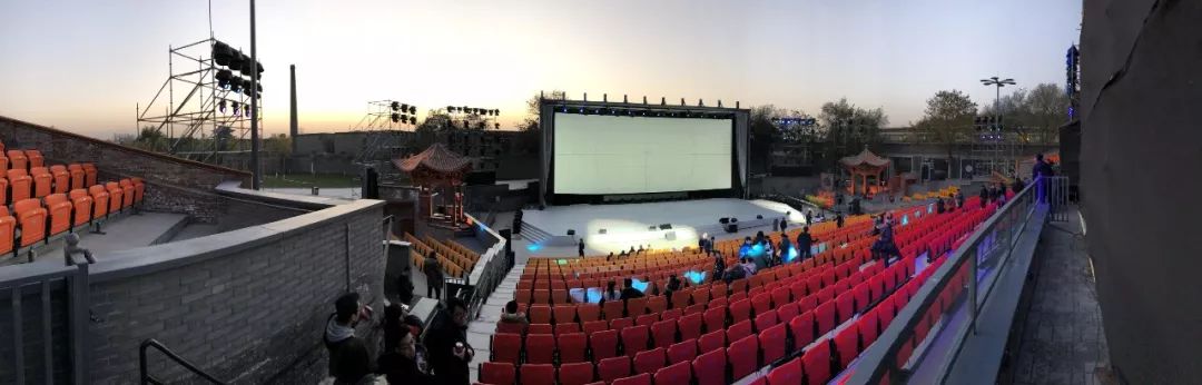 在工业化效果突出的入口端,团队做了砖和金属构成的大尺度入口。而在舞台一侧,专门增加了两处古亭,和两座有圆窗的照壁型砖墙。曾经被质疑在一个场地两边同时出现两个所谓风格,这似乎有违一般的设计原则理解。但是在设计团队的坚持下,用场地整体,用规划的角度来解读建筑,还是得到了理解。最终开幕式上,眼前的古亭与远处的城楼剪影完成了空间上的延续。而那个有圆洞的照壁,成为了诸多明星进场前,专门亮相的仪式。