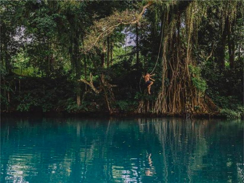 和天空一样美丽的Matevulu蓝洞早已被欧美人挖掘,成了玩水的好去处。枝叶繁茂的榕树下,身手敏捷的游客拽住绳索像荡秋千般临水划过。如果时间充裕,完全可以奢侈地花上一个下午的时间在这里玩耍,人多更好玩。