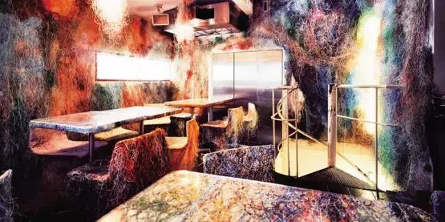 在这家店,隈研吾用回收的废旧电缆线作为基础,同时在墙壁、天花板、照明器材,乃至家具上大量使用亚克力板,使物体的形态消失,营造出浮游在物质感与色彩感空间中的感觉,以此赋予这个空间独特的魅惑效果。