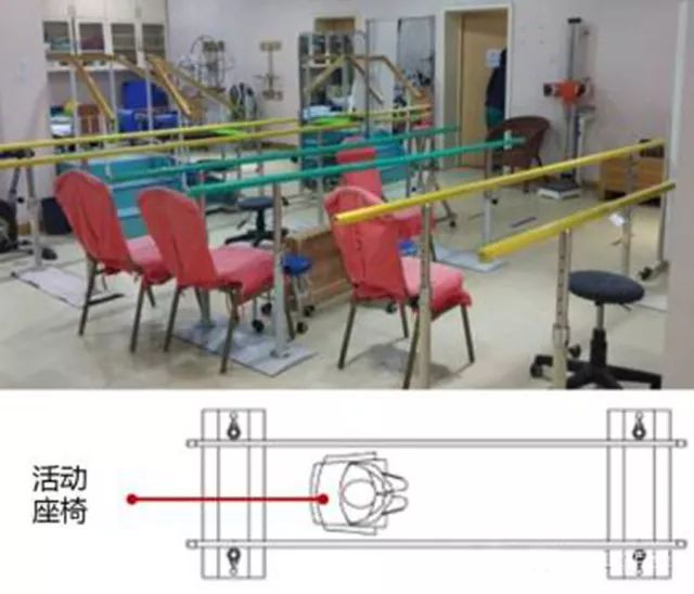 在实际情况中,康复治疗师会准备轻便的椅子,放置于平行杠周围,在老人训练过程中需要休息时,将椅子推到老人训练位置,便于老人坐下。