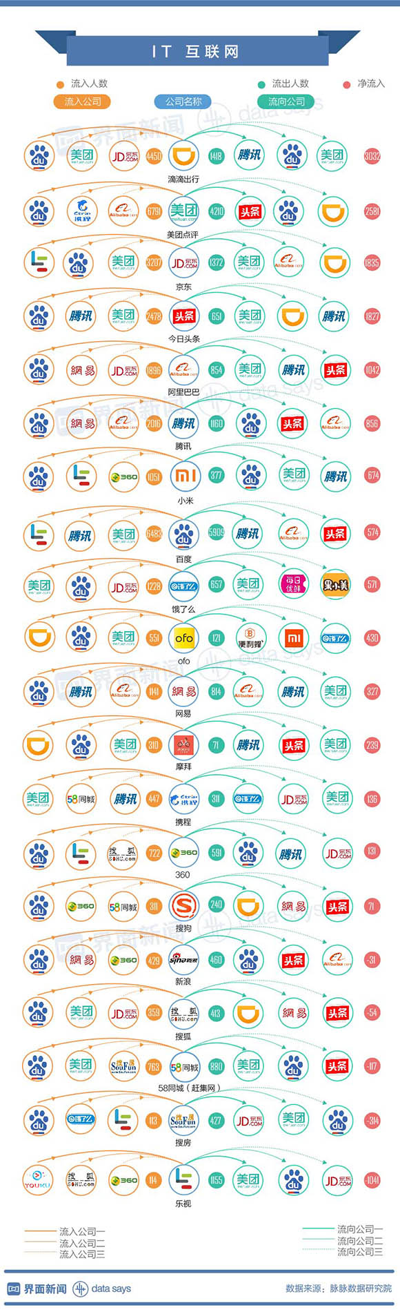 除了美团点评,从数据中也可看出,2017年吸收不少乐视背景员工的京东也在大量招新,其净流入甚至仅次滴滴、美团,排在第三。
