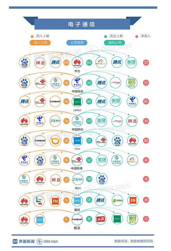 数据显示,中国移动、中国电信和中国联通三大运营商里,涌现了不少跳往互联网的出走者。而美团点评和腾讯是其中很多人才的新大陆。