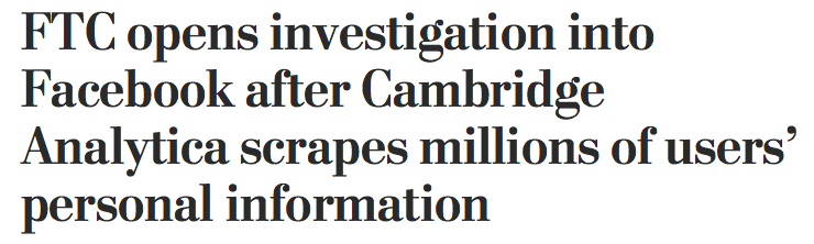 【美国联邦贸易委员会调查Facebook用户信息泄露】据知情人士透露,美国联邦贸易委员会(FTC)对Facebook展开调查,此前有报道称,一家为特朗普竞选团队工作的数据分析公司在未经许可下不当获取该社交网站上千万用户的个人信息。
