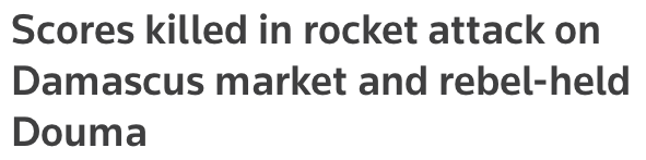 【叙利亚大马士革一市场遭火箭袭击,几十人丧生】叙利亚官方媒体报道,首都大马士革东郊一个繁忙的市场周二遭火箭袭击,至少35人丧生,救援人员称,叙利亚和俄罗斯在附近叛乱武装占领地区发起的空袭导致几十人丧生。