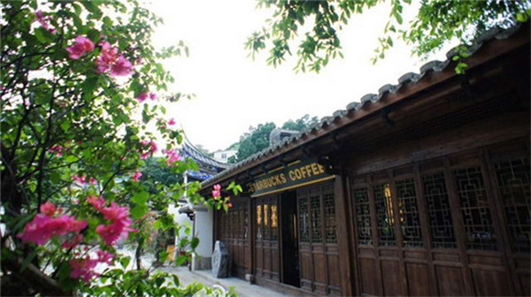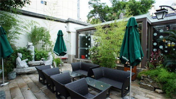 青瓦红檐、亭台楼阁,宋代风格的园林式建筑里花草山石点缀其间,古色古香,置身其中禁不住有穿越时空之感。在咖啡的香气缭绕中遥想古人风采也是醉了。