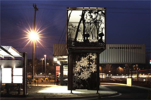 这家命名“再生汽车咖啡”的门店由四个回收的集装箱组成,集装箱一侧的图案在灯光映照下是不是别有一番情趣?