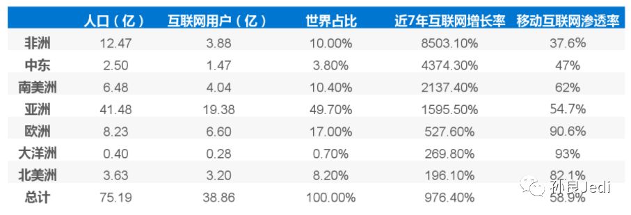 在互联网用户层面,36氪整理的数据显示,2017年南美洲6.48亿人口中有4亿是互联网用户,渗透率高达67.3%,仅次于欧洲、大洋洲及北美洲,比中日韩所在的亚洲还高出几个百分点。不仅基数大,该地区的互联网成长也十分惊人,过去七年互联网用户年平均增长率高达305%。GSMA数据预测,未来五年内拉美地区将是全球移动用户渗透率增长量第二大的区域,仅次于亚太。