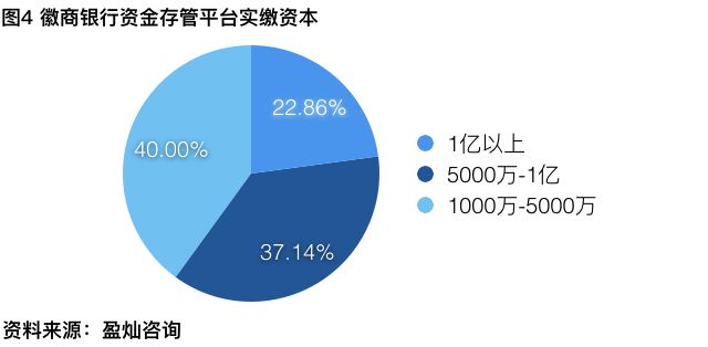 截至2018年2月底,在上线徽商银行存管的35家平台中,实缴资本在1亿以上的平台有8家,占比为22.86%;实缴资本在5000万至1亿的平台有13家,占比为37.14%;实缴资本在1000万至5000万的平台有14家,占比为四成。所有平台的注册资本都在1000万以上。